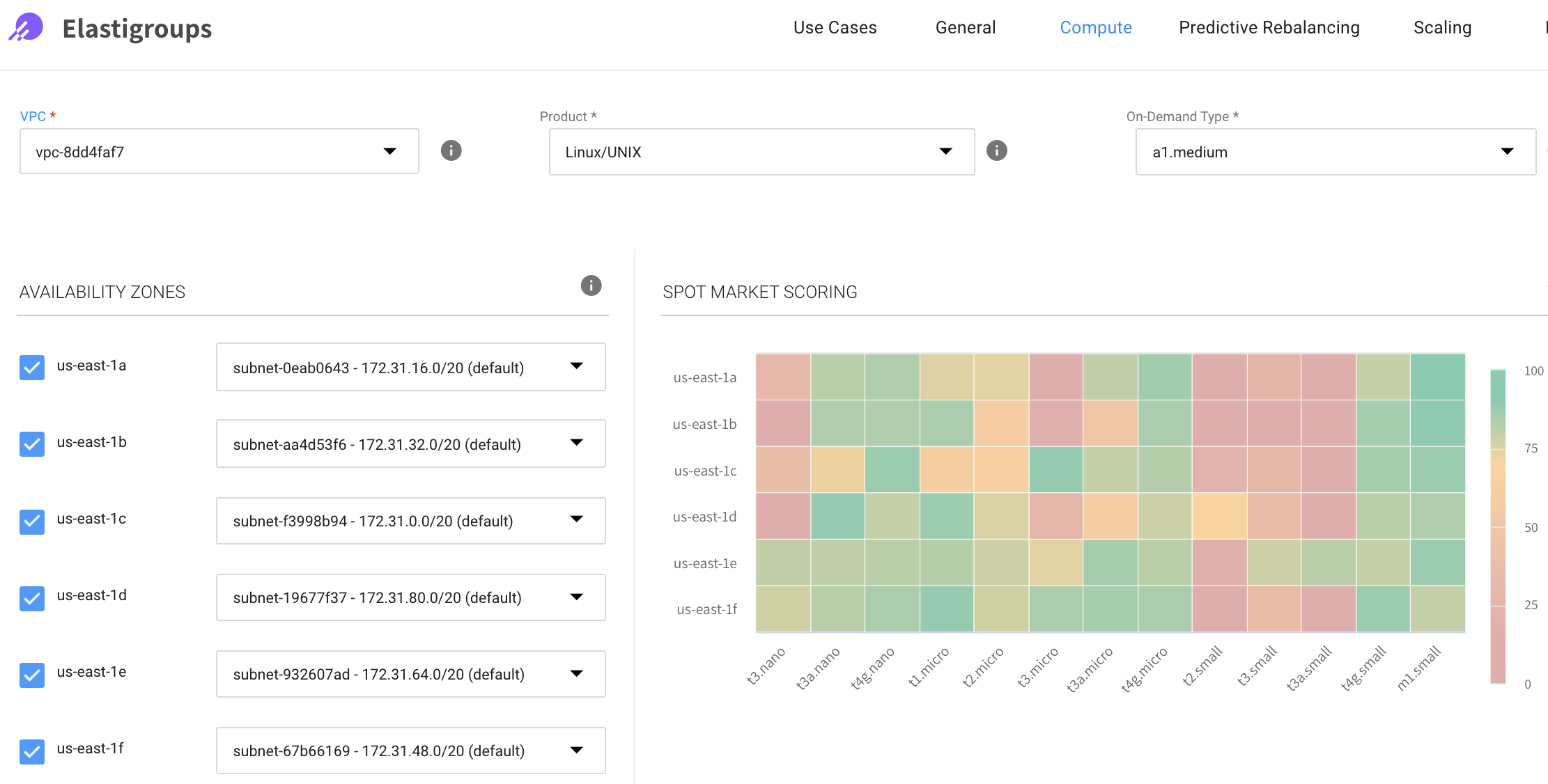 tipTo diversify the spot markets available for the Elastigroup, it is highly recommended to choose all the AZs listed for the region.
