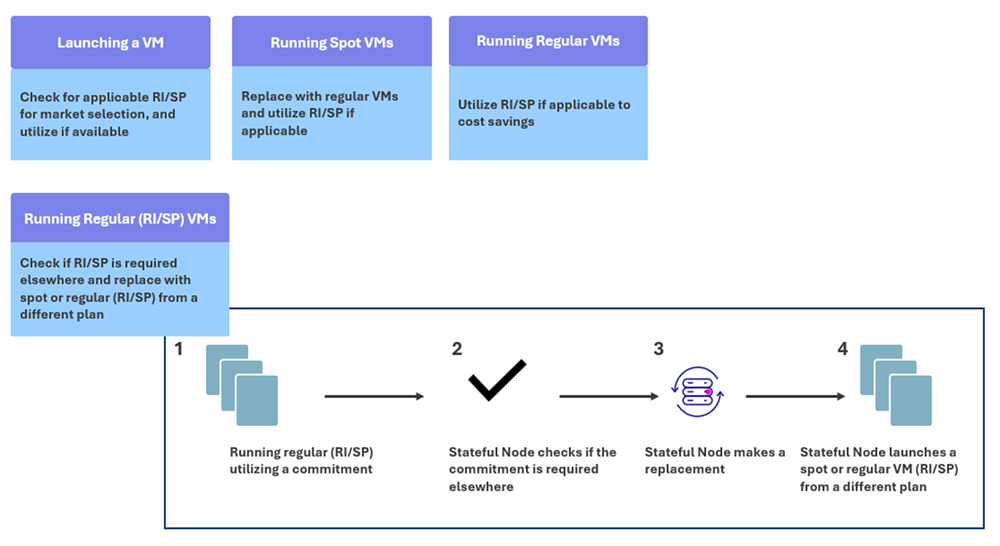 Stateful Node launches either a spot VM or an alternative regular RI/SP VM to use a different plan. This maximizes commitment coverage and helps achieve optimal allocation.