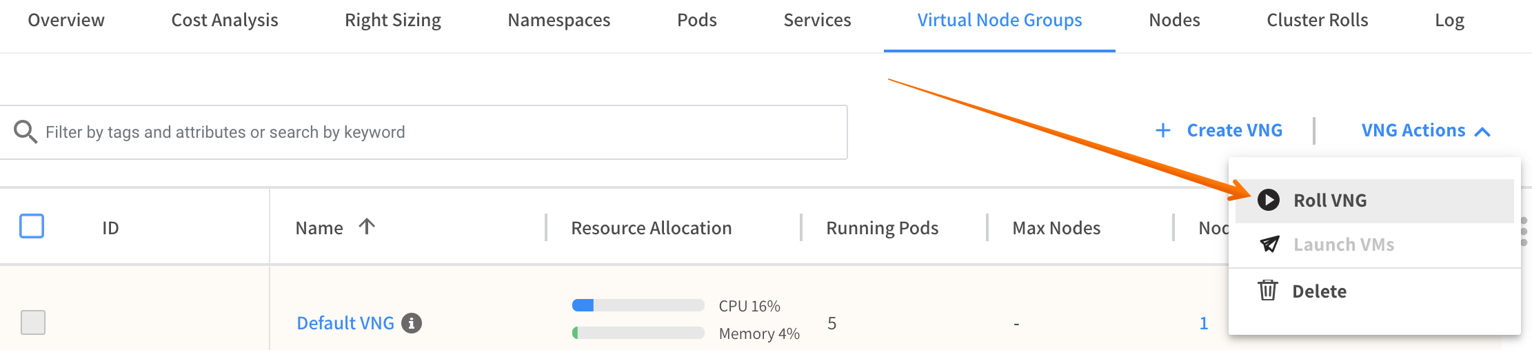 Enter the Batch Size and Comments, indicate whether you want to respect the pod disruption budget, and click Roll VNG(s).