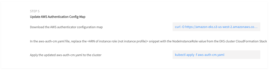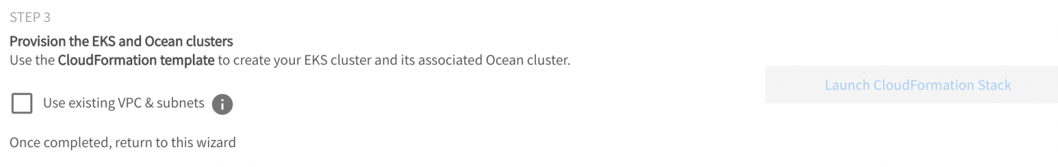 - Connect your workstation to the EKS cluster by copying the command shown in Step 4 of the Create page and running it in your command-line interface. Note that the command must include the Ocean Cluster Name that you entered previously.